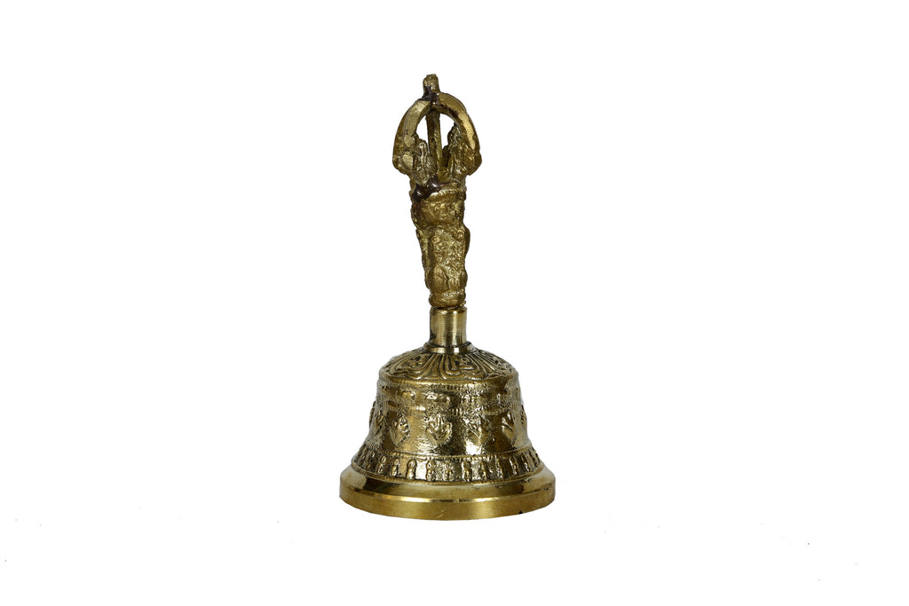 Tibetan Temple Bell. Made of Copper, Bronze, Tin. Comes With Green Protective pouch. This is a high quality Tibetan large handcrafted Solid Bell decorated with embossed Tibetan Buddhist dorji. This Handmade Tibetan Buddhist Prayer Bell seven metals alloy including brass and bronze where traditional metal craft support the entire community. The Bell has great sound. This Handmade Tibetan Buddhist Prayer Bell can be also used to call practitioners for meditation, yoga or family.