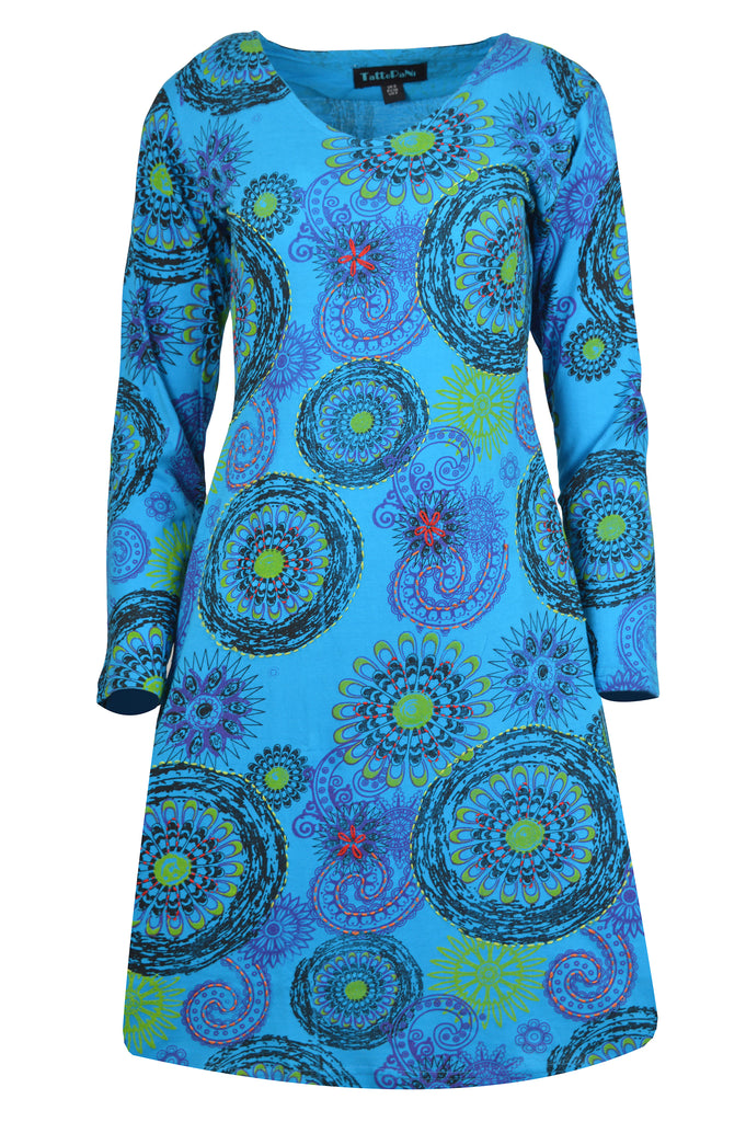 Tattopani women's long sleeve dress all over floral print design. 100% cotton for comfortable and soft feeling. Uniquely hand sewn embroidery.