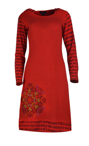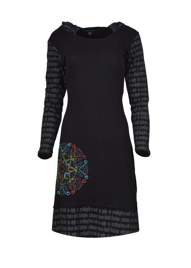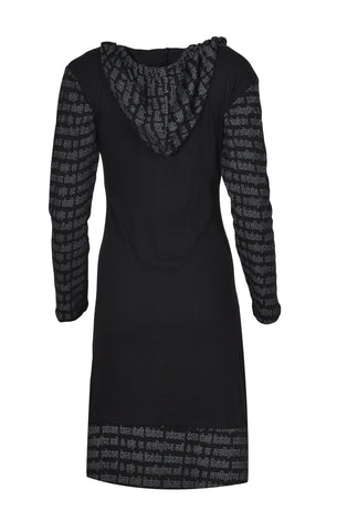 Tattopani women's long sleeve dress with mantra print on sleeves and side embroidery. Attached Hood. 100% cotton for comfortable and soft feeling. Uniquely hand sewn embroidery.